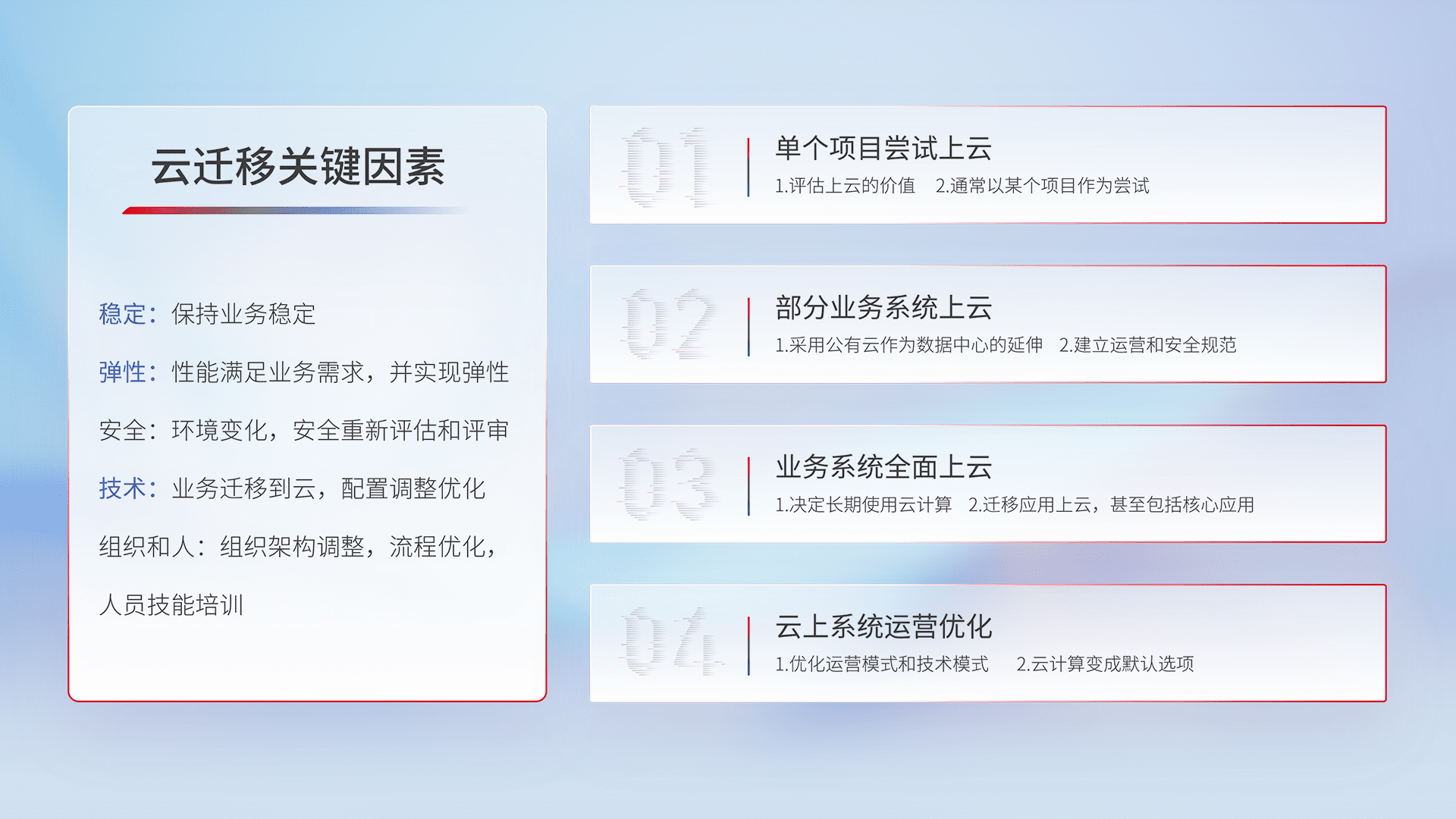 结合实际业务,,从规划设计、、、云平台选型、、云原生改造、、数据迁移、、集成交付,,,,迁移全过程为客户识别最佳上云路径,,做好风险识别管理,,,设计网络架构、、身份权限、、安全审计合规、、、操作审计、、、、日志审计、、、、监控告警策略、、、、多站点容灾设计等,,对云上基础设施进行整体规划,,提升IT治理水平,,以满足弹性、、、高可用、、、、高性能的需求。。。。