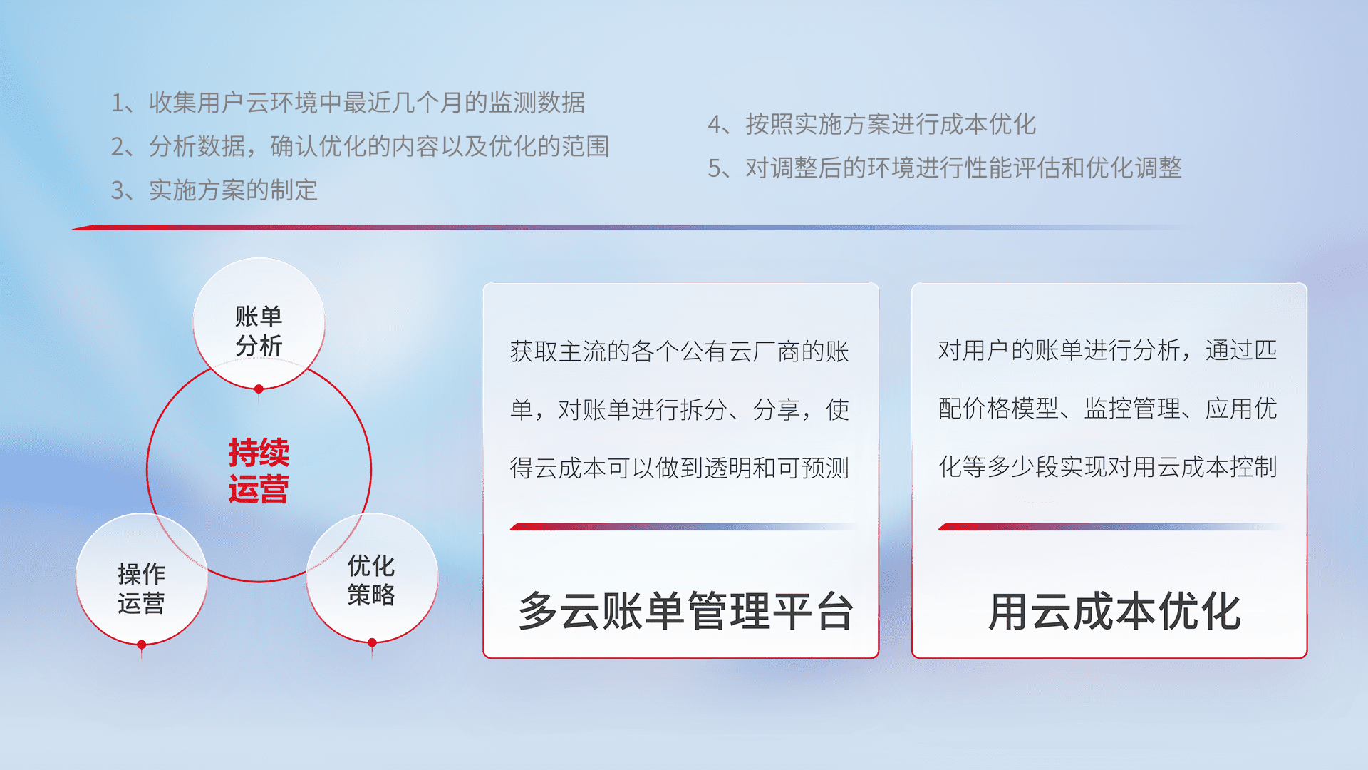 通过多云纳管,,以统一的资源数据模型把客户的云资源进行抽象和封装,,进而实现对多云资源的统一操作,,,保障云资源管理的可靠性、、、、稳定性与可用性。。。量身定制化运维内容,,,配置、、、、开发运维、、、补丁管理、、、、备份、、监控、、认证和访问管理、、、审计和日常巡检等,,保障在用云过程中的可靠度,,稳定度以及高可用率。。。。