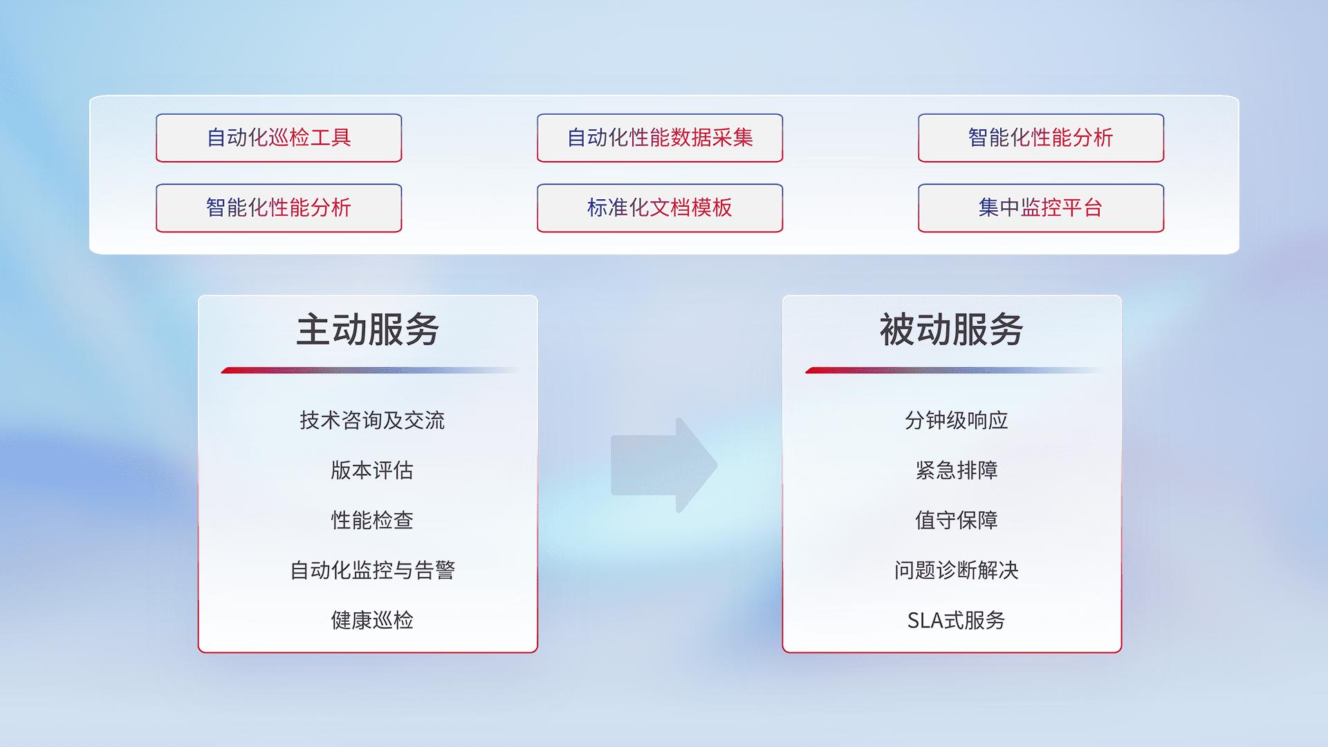 智能化工具和标准化文档,,保障服务质量,,提供主动服务(包含技术咨询、、、版本评估、、、性能检查、、、、自动化监控与告警、、、健康巡检)和被动服务包含(分钟级响应、、紧急排障、、、、值守保障、、问题诊断解决、、、SLA服务)。。。