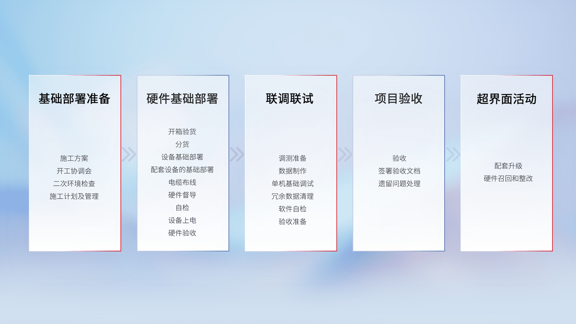 从基础部署准备、、硬件基础部署、、、、联调联试、、、、项目验收、、、越界面活动的全过程可追溯,,,,保证施工质量和进度。。。。
